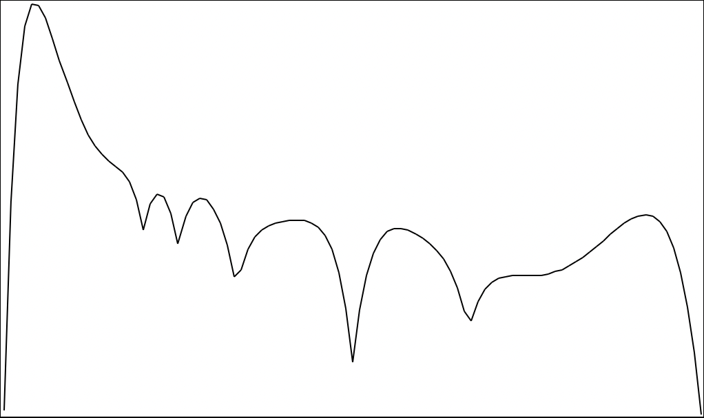 I’ve implemented Helmholtz’s dissonance curves as BPFs in OpenMusic. Here’s the standard profile for one octave: