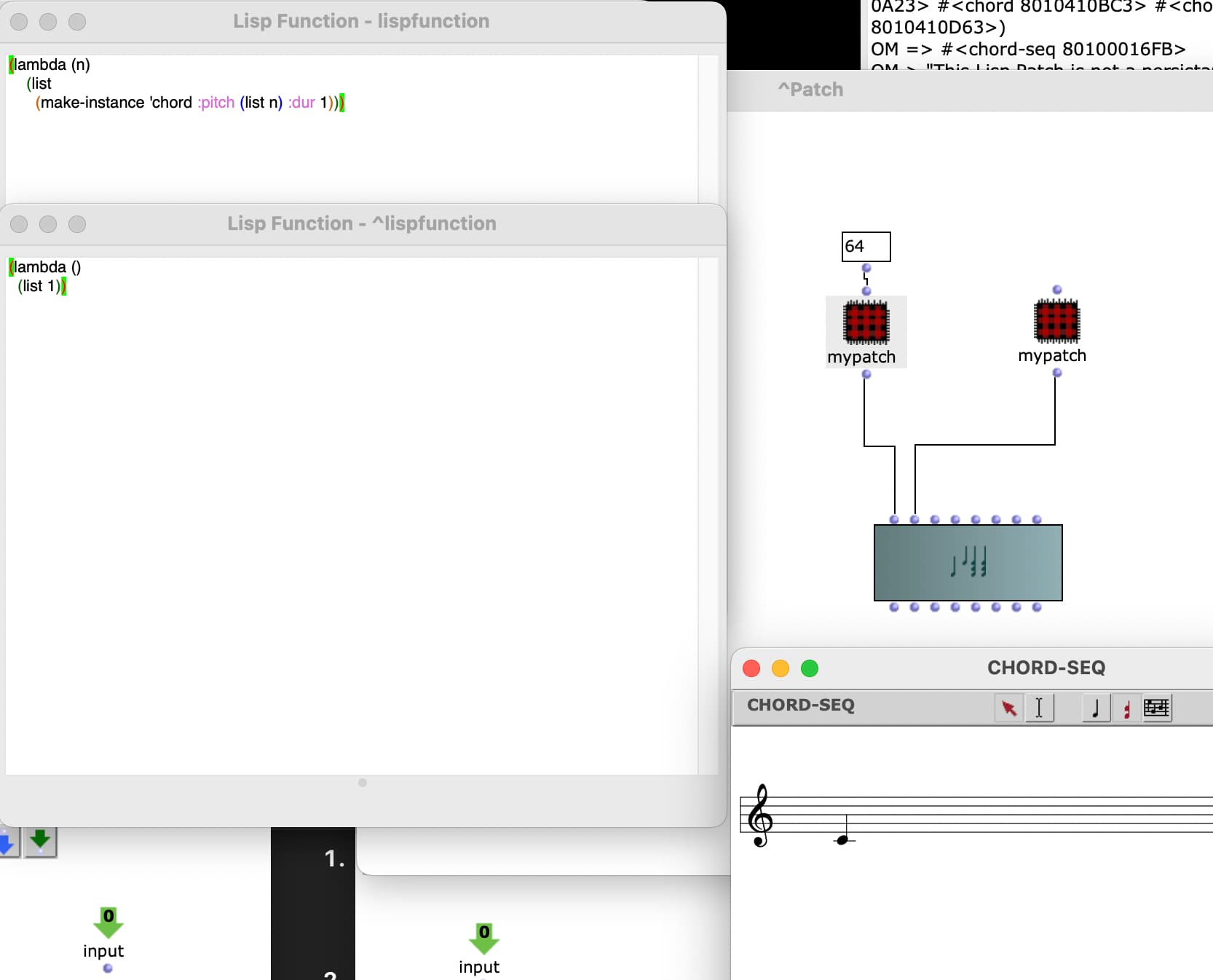 Je travaille avec OpenMusic 7.7 et j’essaie d’utiliser des Number Box pour modifier dynamiquement le pitch et la durée (dur) d’accords générés via un Lisp Function, mais cela ne fonctionne pas comme prévu. Voici la structure actuelle de mon patch :
